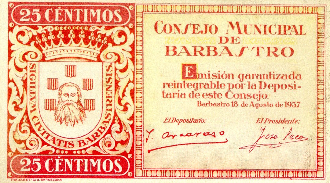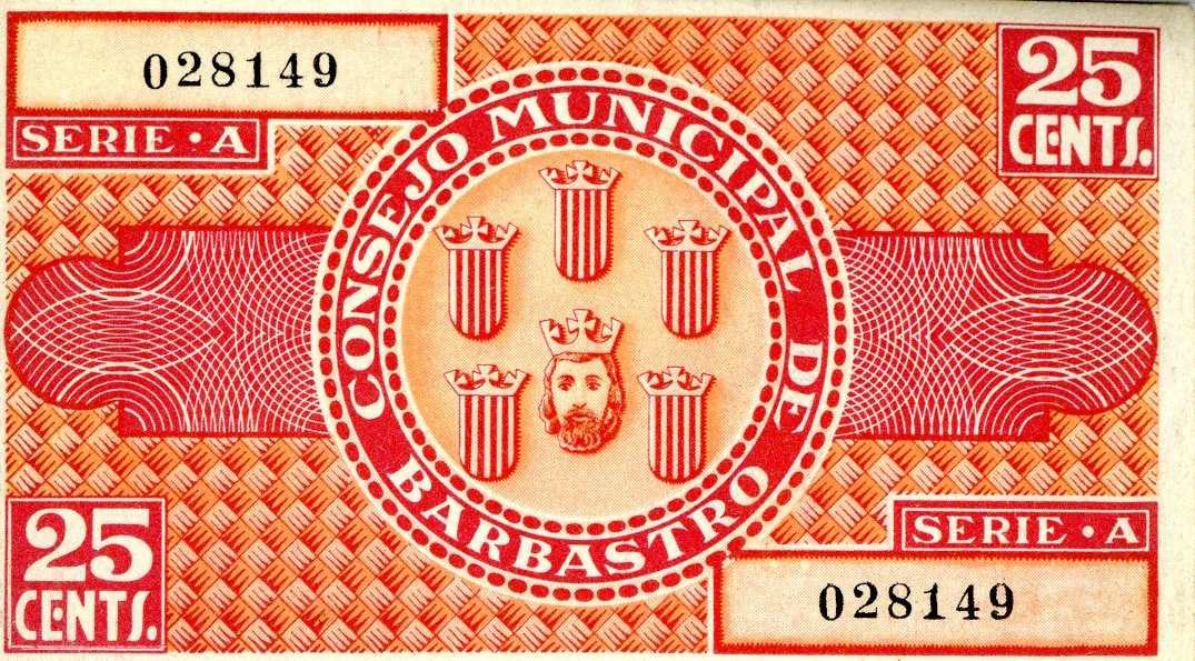 Resumen: Billete emitido por el Consejo Municipal de Barbastro. 25 céntimos. 1937. Nº serie: 028149.