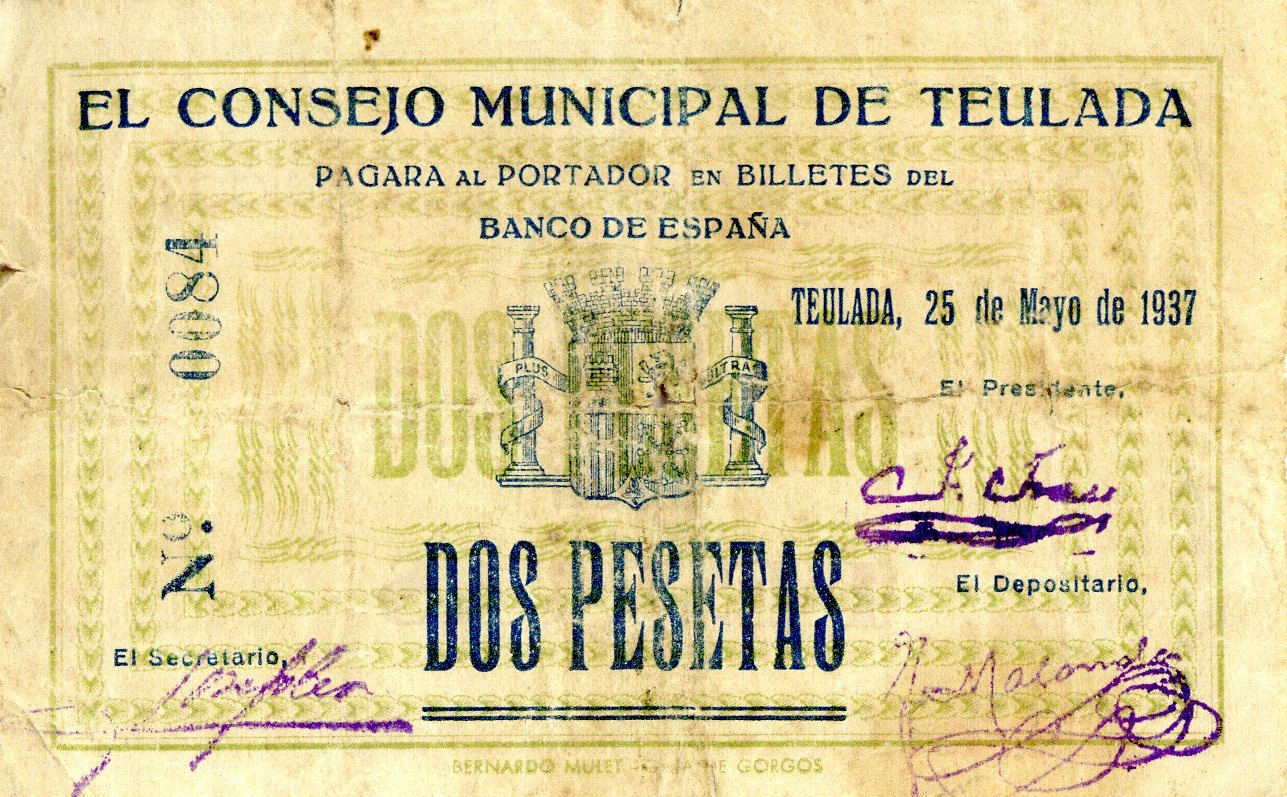 Resumen: Billete emitido por el Consejo Municipal de Teulada el 25 de mayo de 1937. Nº serie: 0084.