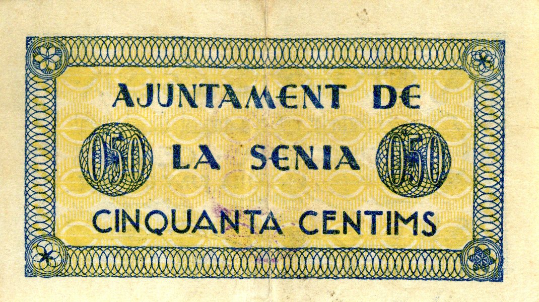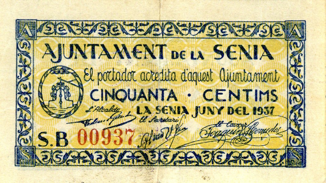 Resumen: Billete emitido por el Ajuntament de La Senia. 50 céntimos. 1937. Nº serie: B 00937.
