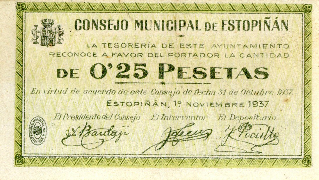 Resumen: Billete emitido por el Consejo Municipal de Estopiñán. 25 céntimos. 1937. Nº serie: 0260.