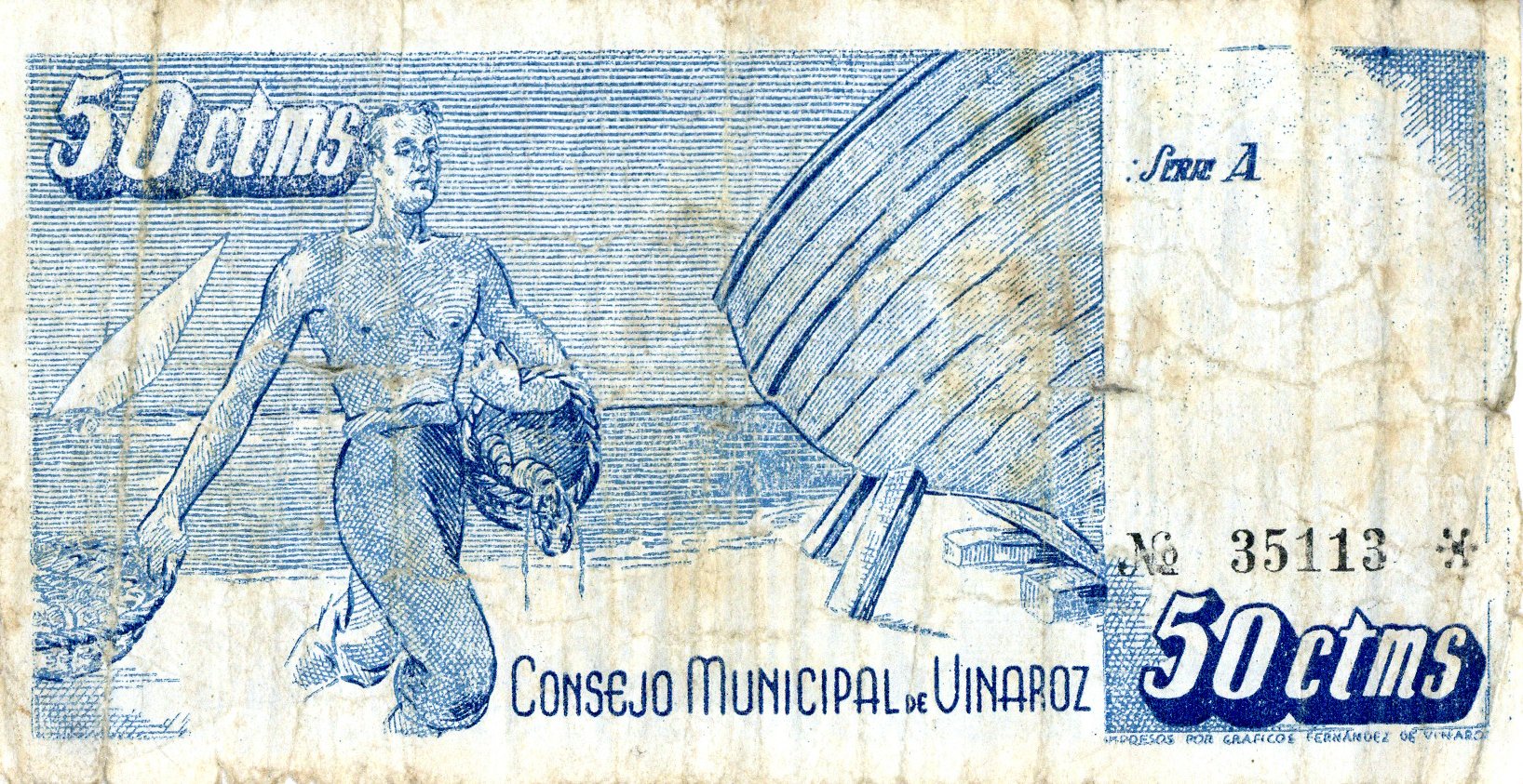 Resumen: Billete emitido por el Consejo Municipal de Vinaroz. 50 céntimos. 1937. Nº serie: 35113 Serie A. En mal estado.