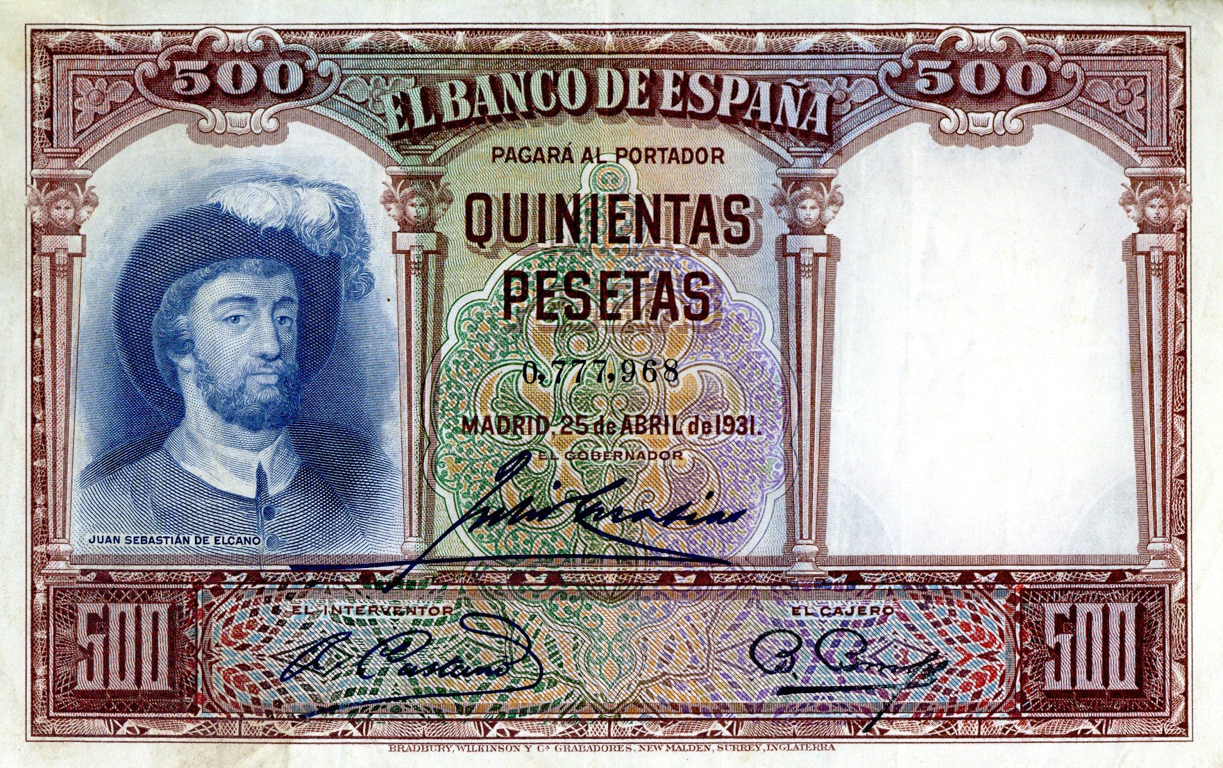 Resumen: Billete de quinientas pesetas emitido por el Banco de España el 25 de abril de 1931 y fabricado en tipografía y calcografía por la casa "Bradbury" de Londres. En el anverso aparece el retrato de Juan Sebastián de Elcano y, en el reverso, el cuadro de Elías Salaverría "Desembarco de Elcano en Sevilla después de dar la vuelta al mundo". También aparece una reproducción de la nao Victoria y, sobre ella, el escudo de armas que le concedió el rey Carlos I, con un globo terráqueo con la leyenda "Primus circumdedisti me". Lleva como marca al agua una cabeza de Neptuno con corona y tridente. Nº serie: 0,777,968.