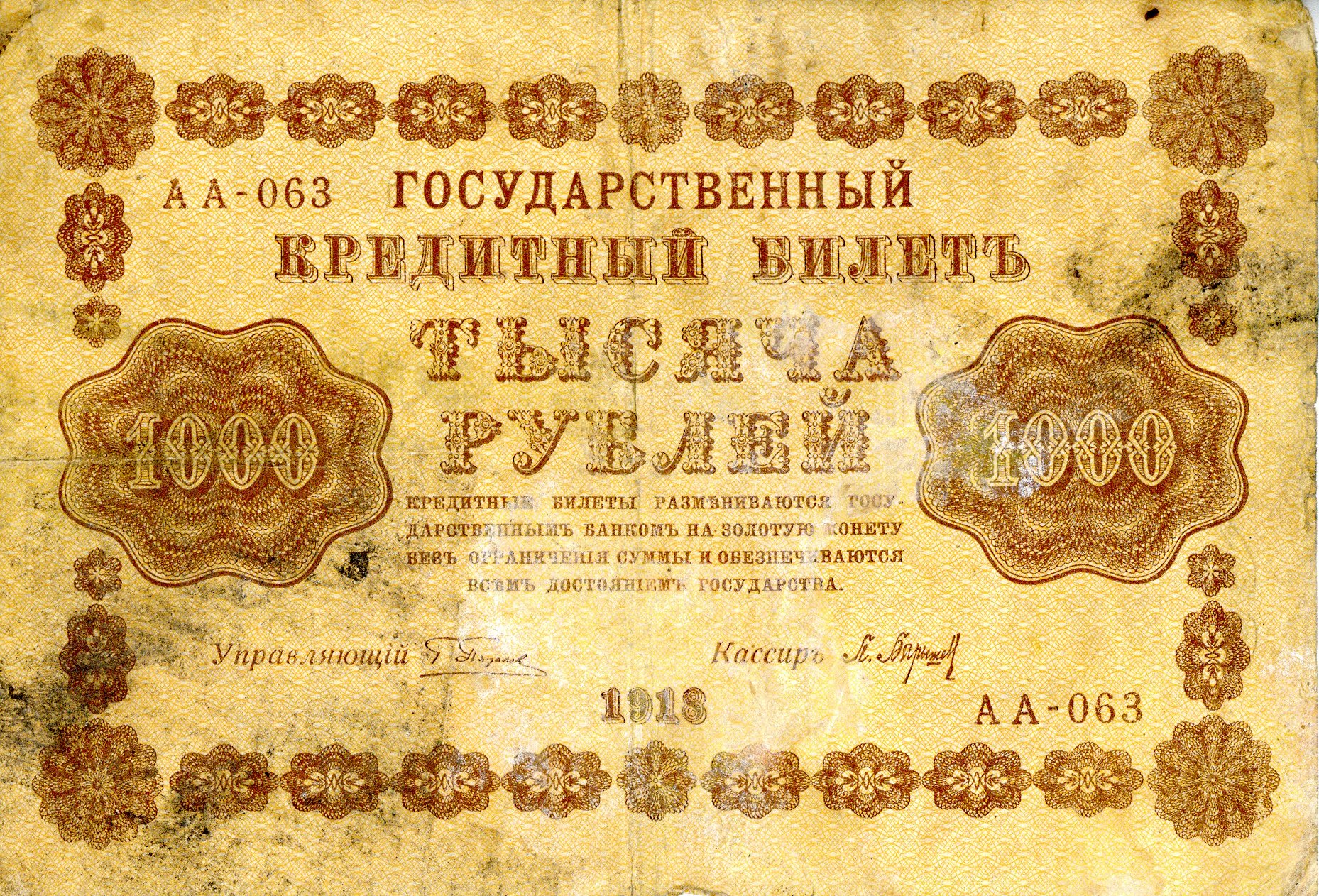 Resumen: Billete emitido por el Ejército Blanco durante la guerra civil rusa. 1000 rublos.1918. Nº serie: AA – 063.