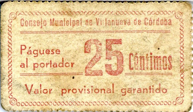 Resumen: Vale emitido por el Consejo Municipal de Villanueva de Córdoba. 25 céntimos. S.f. Sin nº serie.