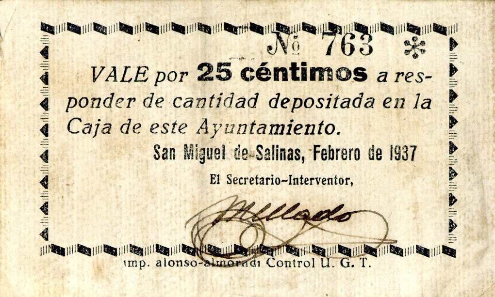 Resumen: Vale emitido por Ayuntamiento de San Miguel de Salinas. 25 céntimos. 1937. Nº serie: 763.