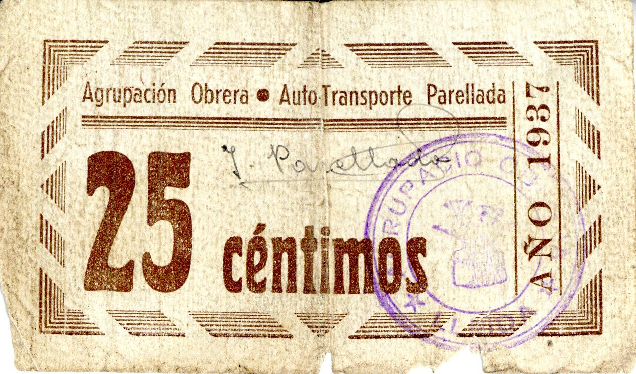 | Título: | 25 céntimos : Agrupación Obrera Auto Transporte Parellada |