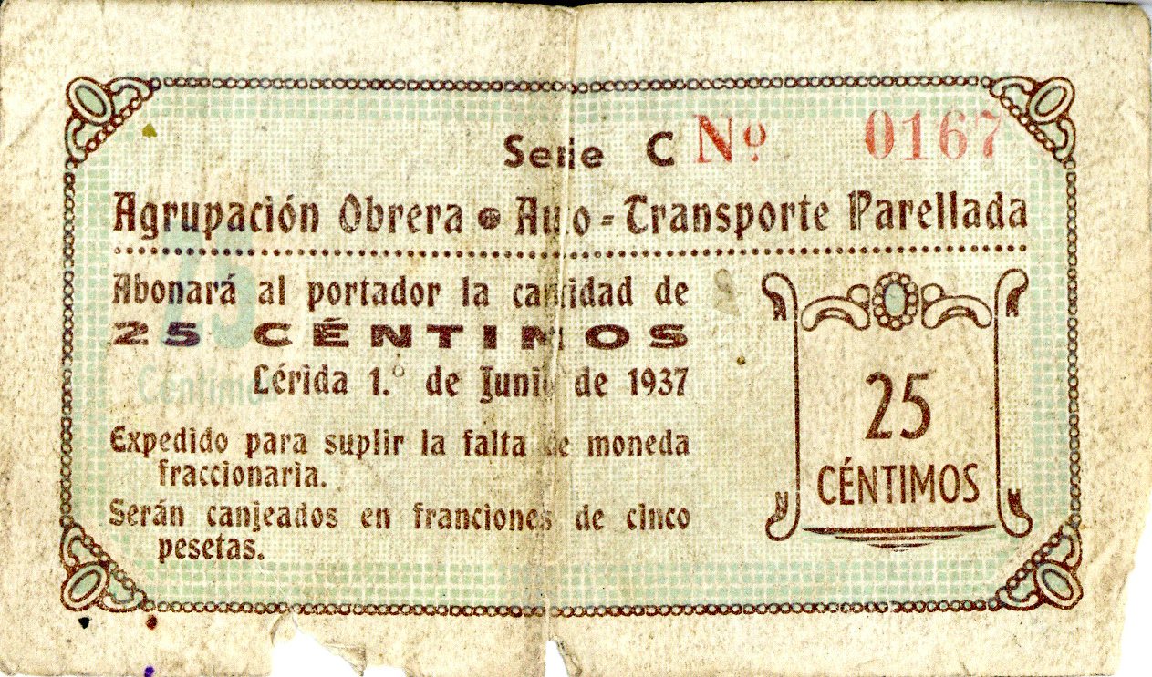 En el anverso : Agrupación Obrera Auto Transporte Parellada abonará al portador la cantidad de 25 céntimos, Lérida 1º de junio de 1937 : expedido para suplir la falta de moneda fraccionaria : serán canjeados en fracciones de cinco pesetas.