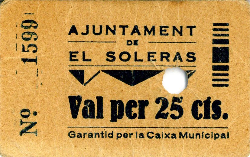 Resumen: Vale emitido por el Ajuntament de El Soleràs. 25 céntimos. S. f. Nº serie: 1599.