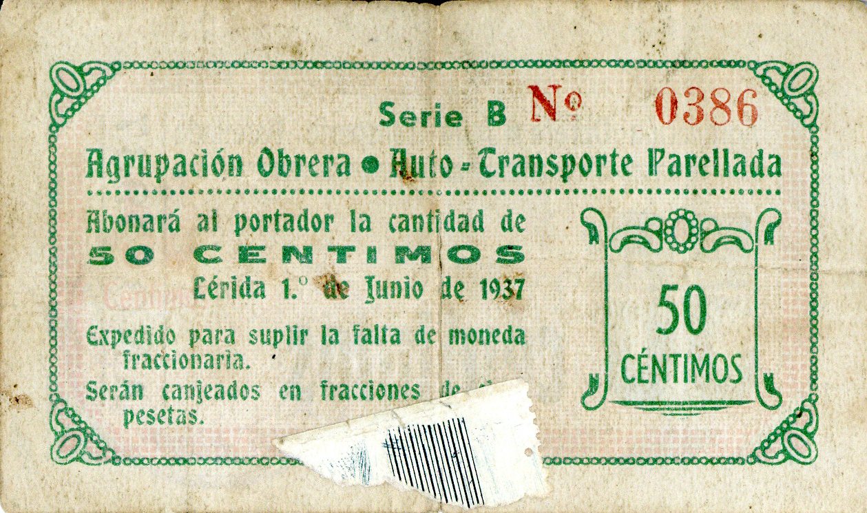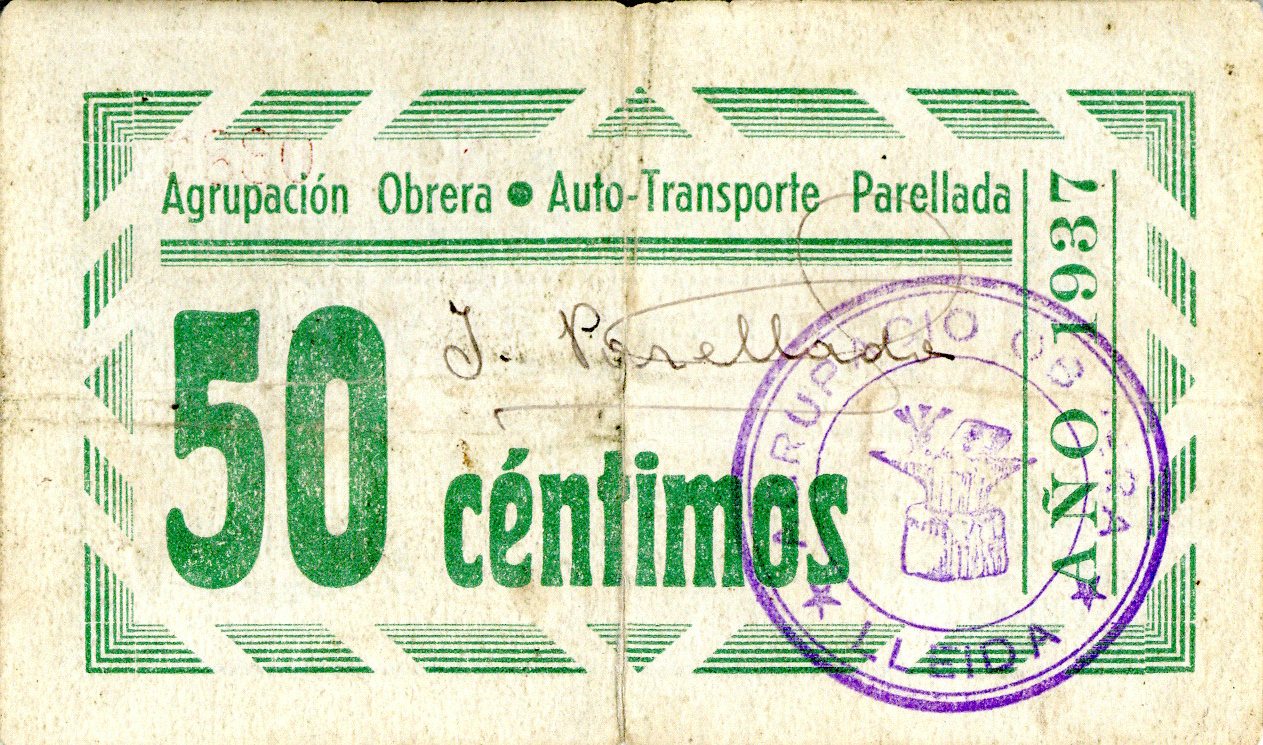 En el anverso : Agrupación Obrera Auto Transporte Parellada abonará al portador la cantidad de 50 céntimos, Lérida 1º de junio de 1937 : expedido para suplir la falta de moneda fraccionaria : serán canjeados en fracciones de cinco pesetas.