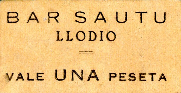 Resumen: Vale emitido por el Bar Sautu de Llodio. 1 peseta. S. f. Sin nº de serie. En el reverso, firma manuscrita. 5 ejemplares.