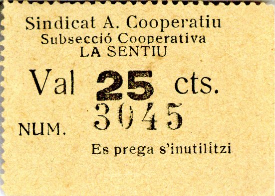 Resumen: Vale emitido por el Sindicat A. Cooperatiu de La Sentiu. 25 céntimos. S. f. Nº serie: 3045.