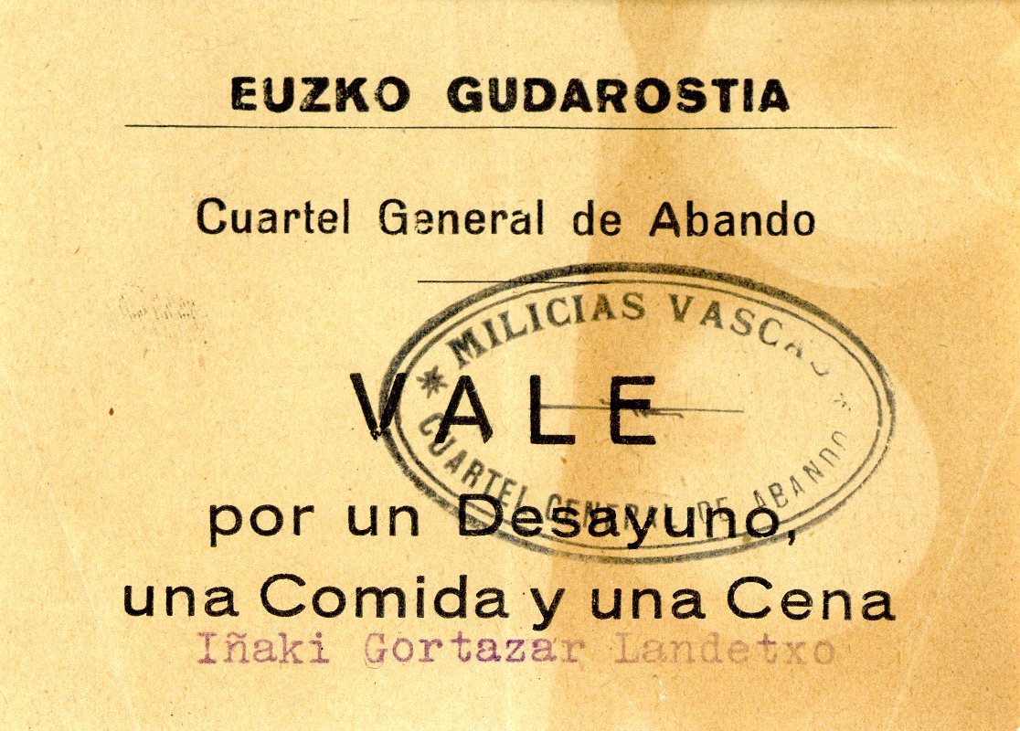 | Título: | Euzko Gudarostia [sic] : Cuartel General de Abando : vale por un desayuno, una comida y una cena |