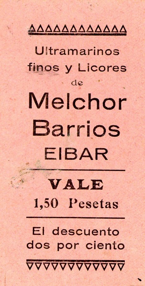 Resumen: Vale emitido por Ultramarinos finos y Licores de Melchor Barrios de Eibar. 1,5 pesetas. S.f. Sin nº de serie. 2 ejemplares.