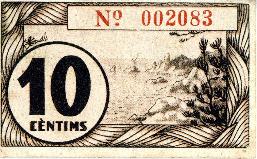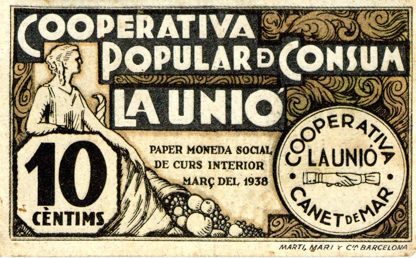 Resumen: Vale de 10 céntimos emitido en marzo de 1938 por la cooperativa de consumo La Unió, de Canet de Mar. Nº de serie: 002083. Simbolo : dos manos enlazadas