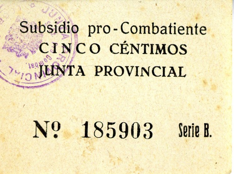 Resumen: Ticket de abono del subsidio Pro-combatientes de Logroño. 5 céntimos. S. f. Nº serie: 185903 Serie B.