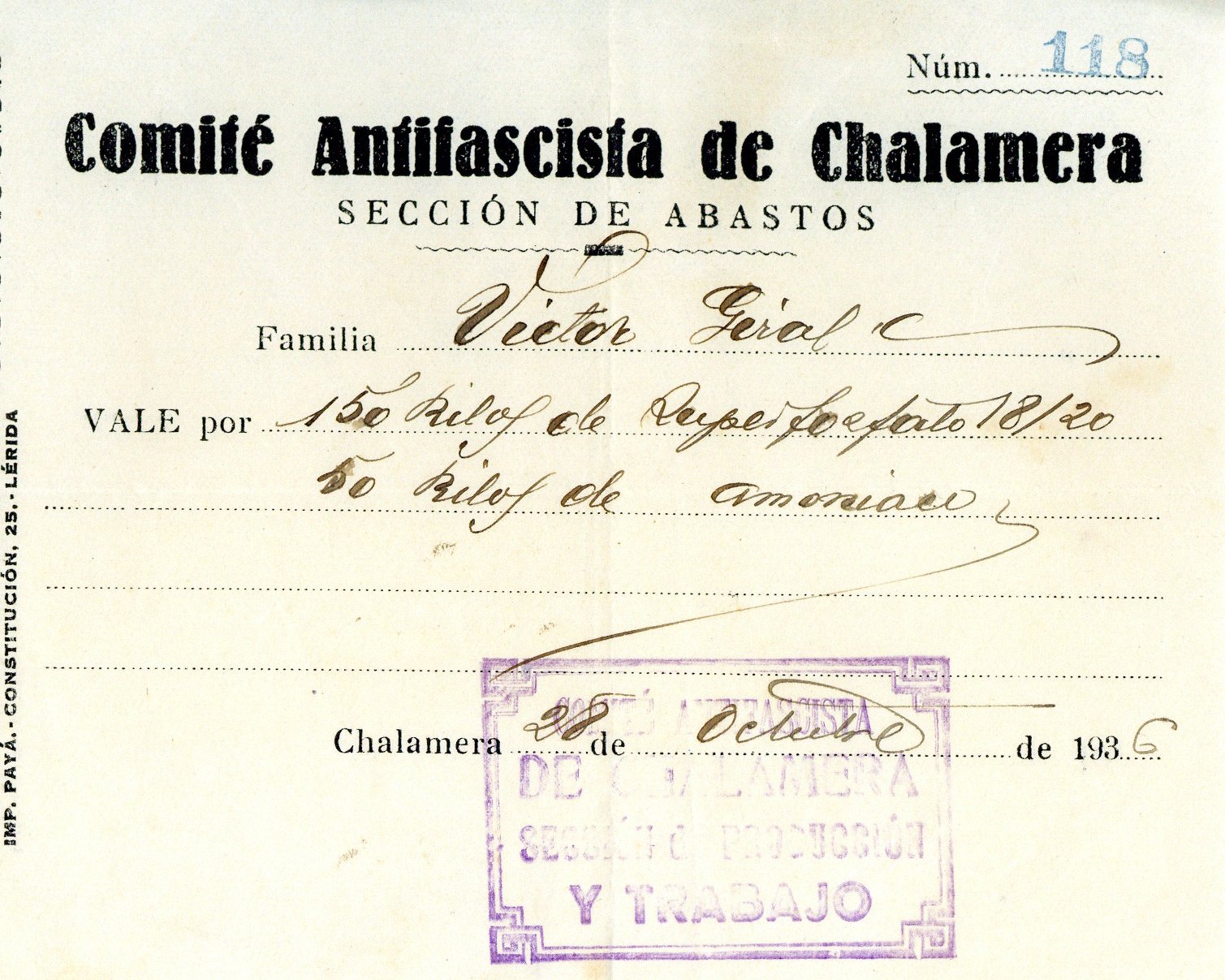 Título: Comité Antifascista de Chalamera, Sección de Abastos : familia Víctor Giral : vale por 150 kilos de superfosfato 18/20, 50 kilos de amoniaco