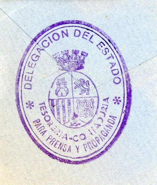 Resumen: Sello estampado sobre papel recortado, de la Delegación del Estado para Prensa y Propaganda.