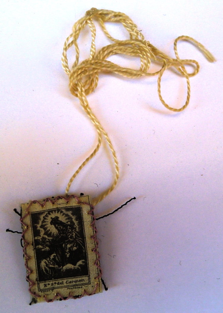 Resumen: Escapulario en tela marrón con un cordón dorado.