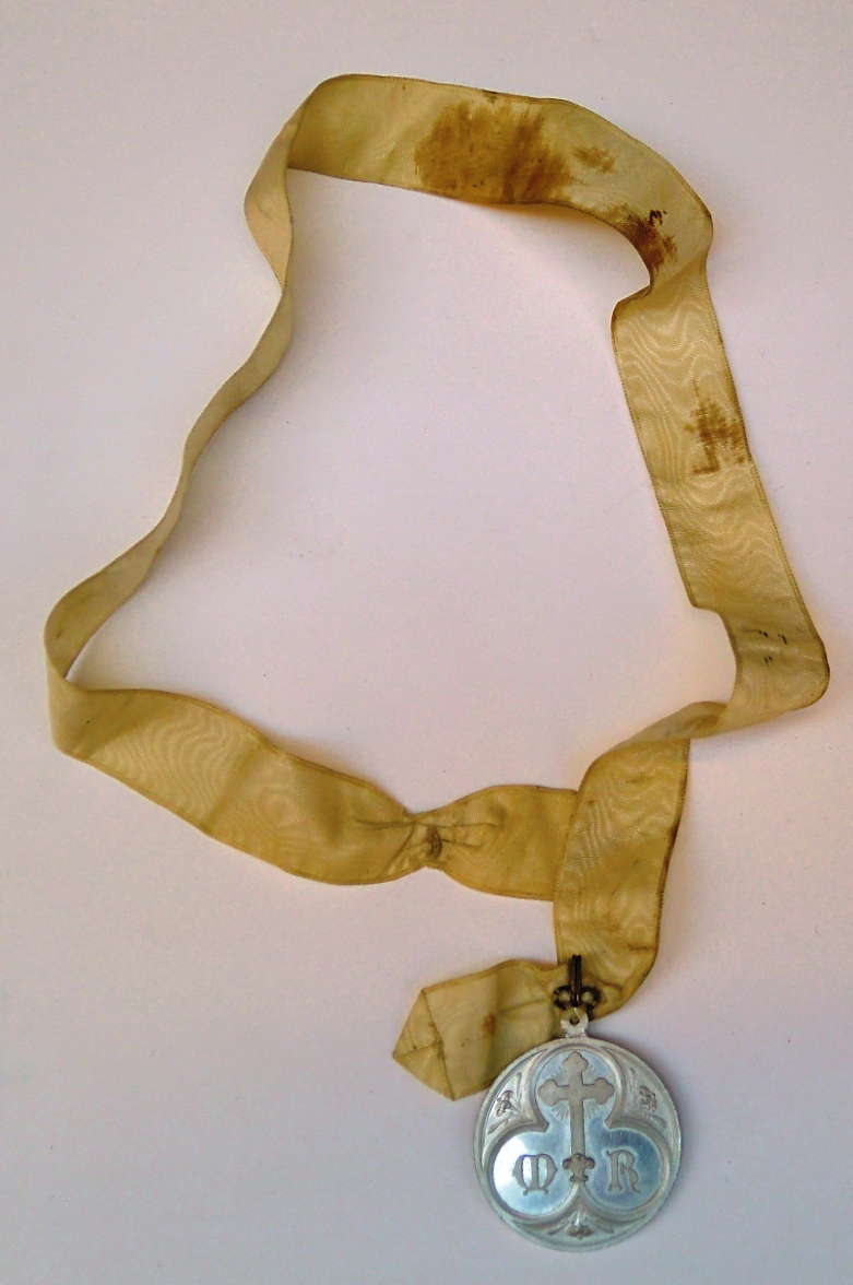 Resumen: Medalla realizada en plata, de forma redonda, con asa circular, marco perimetral y anilla para colgar de la que pende una cinta marrón. En el anverso aparece en relieve la imagen de la Virgen con la inscripción "Medalla virgen virgo reparatrix".