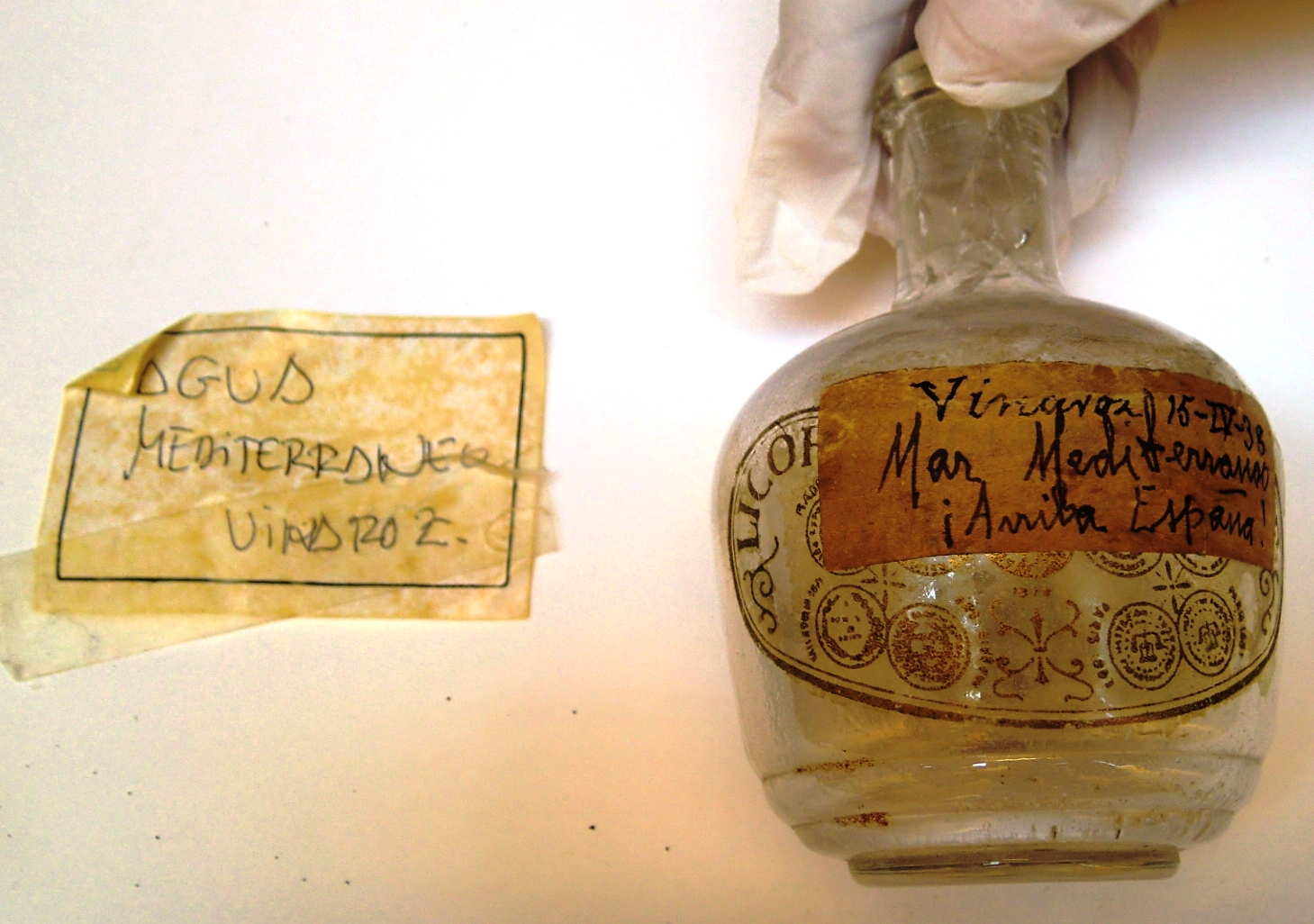 Resumen: Lleva una etiqueta pegada con el siguiente texto "Vinaroz 16-IV-38, Mar Mediterráneo ¡arriba España!" . Recogida con ocasión del corte de la zona republicana en dos.