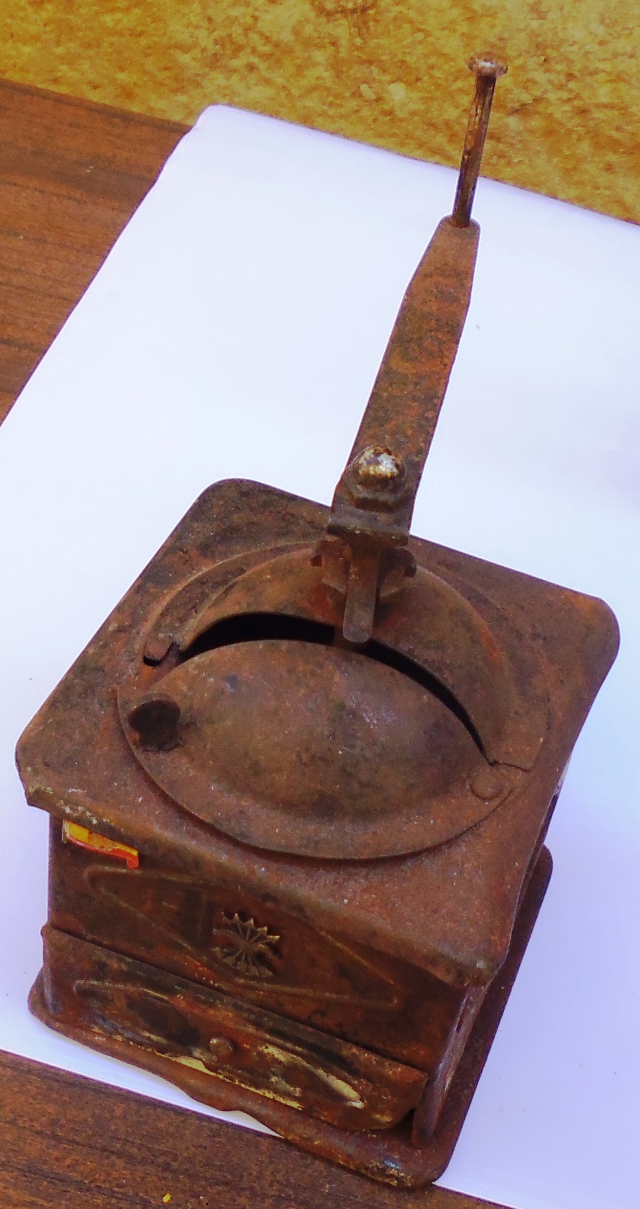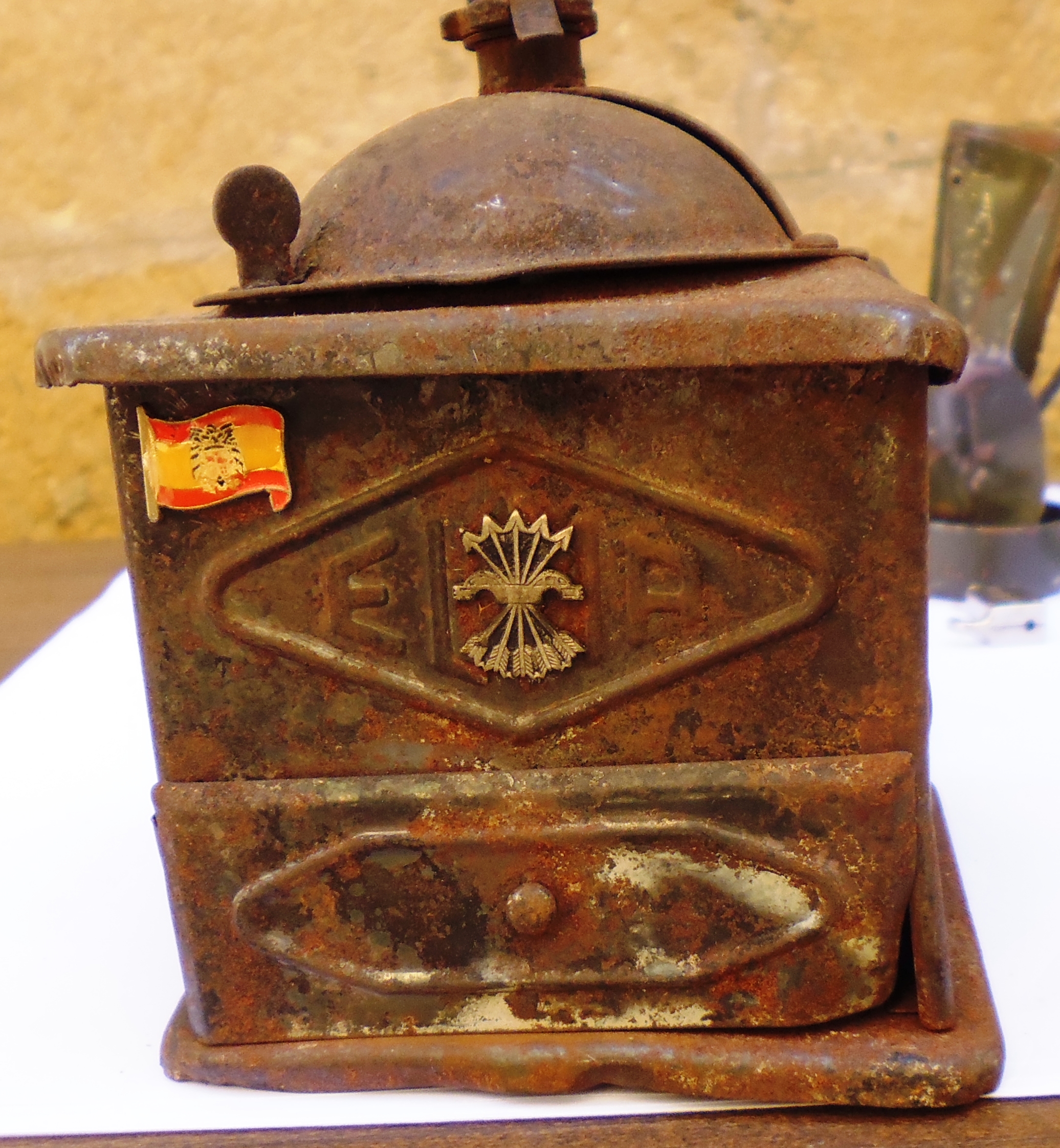 El cuerpo de la pieza lo compone una caja cúbica de hojalata decorada con el yugo y las flechas y la bandera española en color. En la base tiene un recipiente cuadrangular para recoger el café molido. En la cara superior lleva parte del mecanismo de molienda: una pieza semiesférica en forma de cúpula gallonada, con apertura mediante bisagra para introducir el café, de cuyo centro sale un vástago al que se sujeta la manivela, provista de asidero. |
