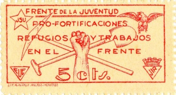 | Título: | Sello de 5 cts. : Frente de la Juventud : pro-fortificaciones, refugios y trabajos en el frente : JSU : FUE : JIR |