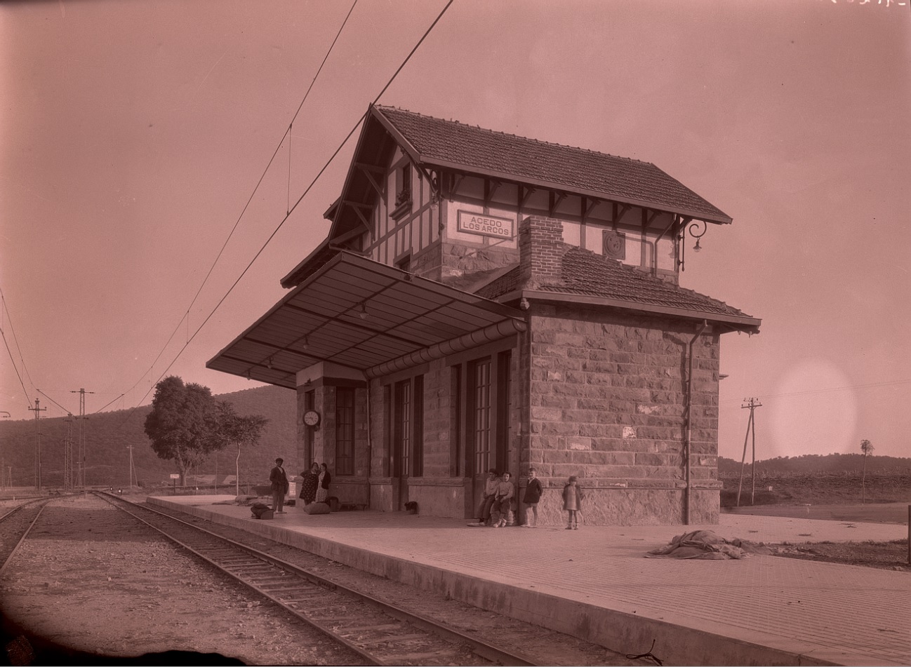 Resumen: Fachada de servicio orientada hacia el oeste y fachada lateral derecha orientada hacia el norte. Esperando al tren vemos a un grupo de víajeros y a unos niños. 28 de septiembre de 1931.