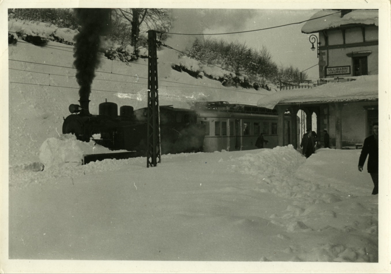 Resumen: Fachada lateral derecha orientada hacia el sur. Aparece una máquina de vapor de la maquinista terrestre tirando de un automotor de la Naval y un grupo de personas abandonando la estación y caminando por la nieve. Hacia 1960.