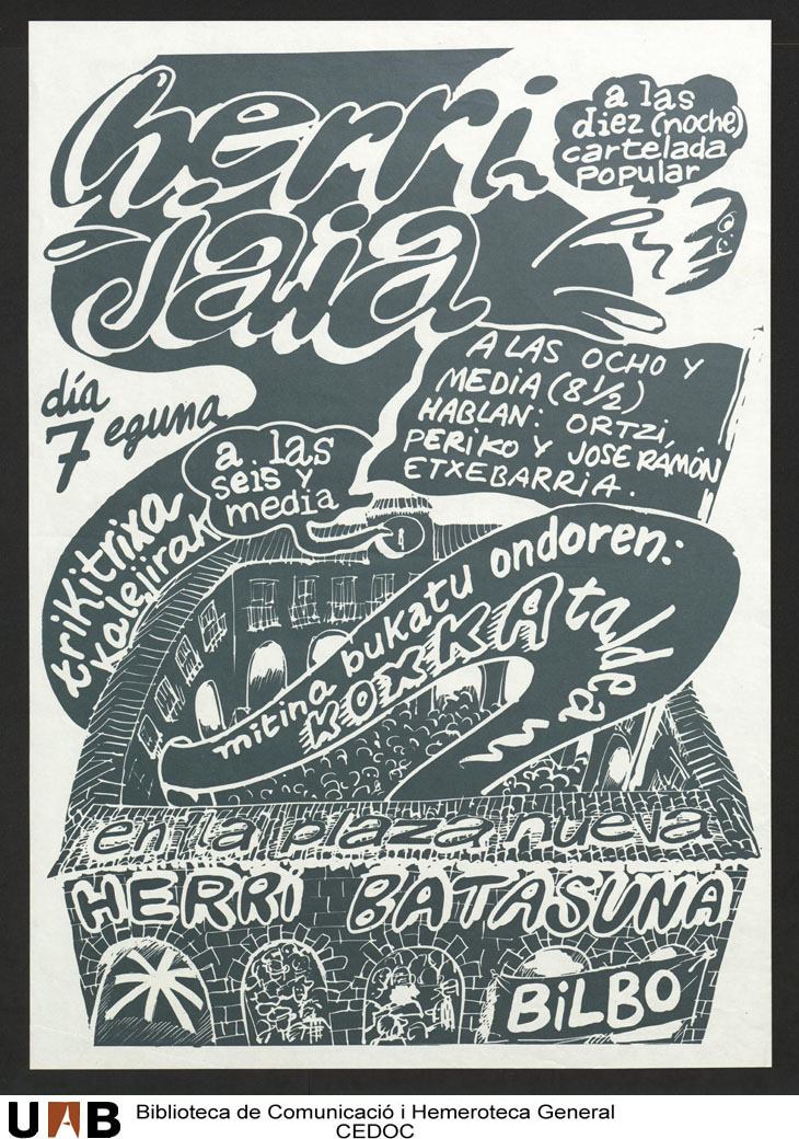 Título: Herri-jaia [Material gráfico] : Herri Batasuna Bilbo... mitina bukatu ondoren Koxka Taldea ... a las ocho y media (8 1/2) hablan, Ortzi, Periko y José Ramón Etxebarria