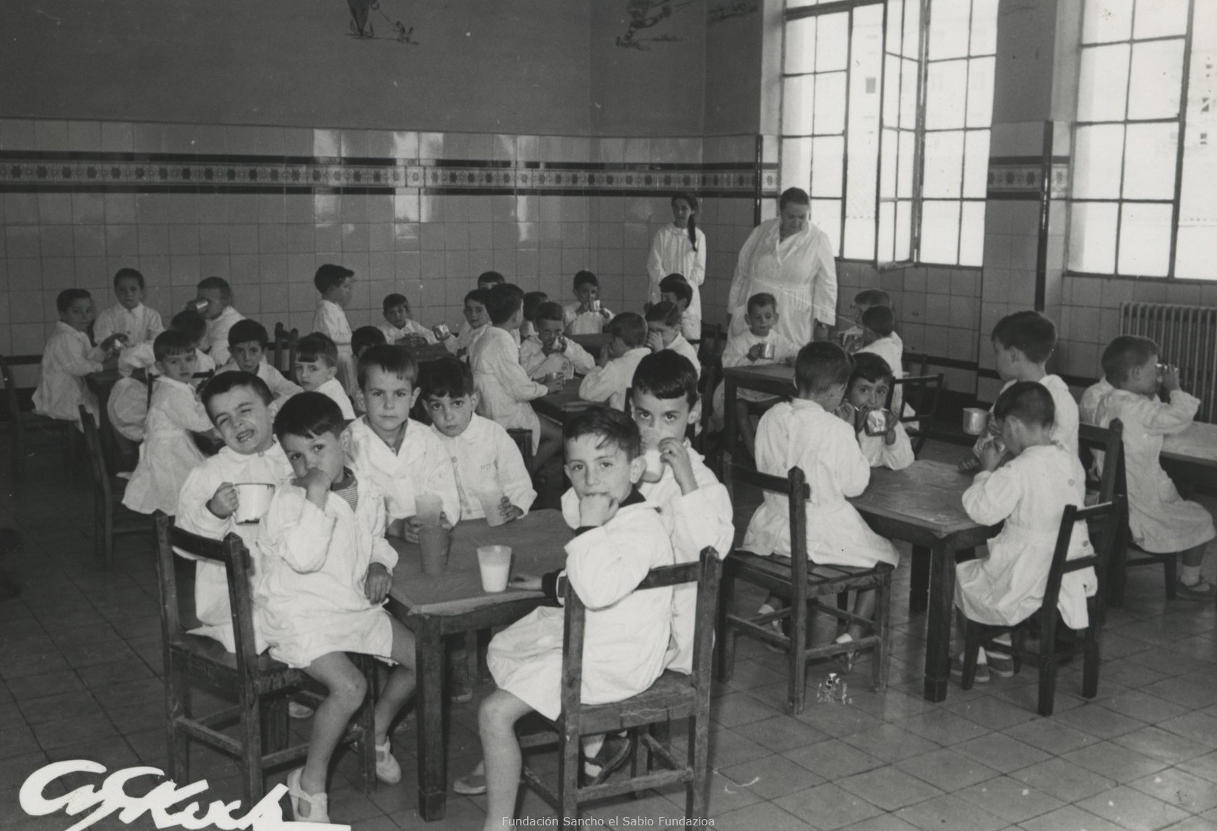 Resumen: Fotografía de la instalación destinada a comedores infantiles, que tras la Guerra Civil Española se habilitaron para una correcta alimentación de los escolares antes de ir al colegio. En época de recesión económica marcada por la posguerra, dicha función tiene gran valor social.